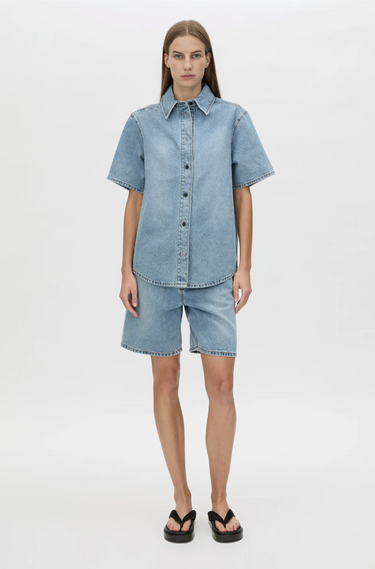 CAMILLA AND MARC Diego short-sleeve denim shirt in light vintage blue. Boxy fit shirt, corozo branded buttons, curved hem.