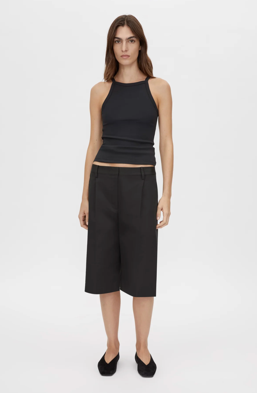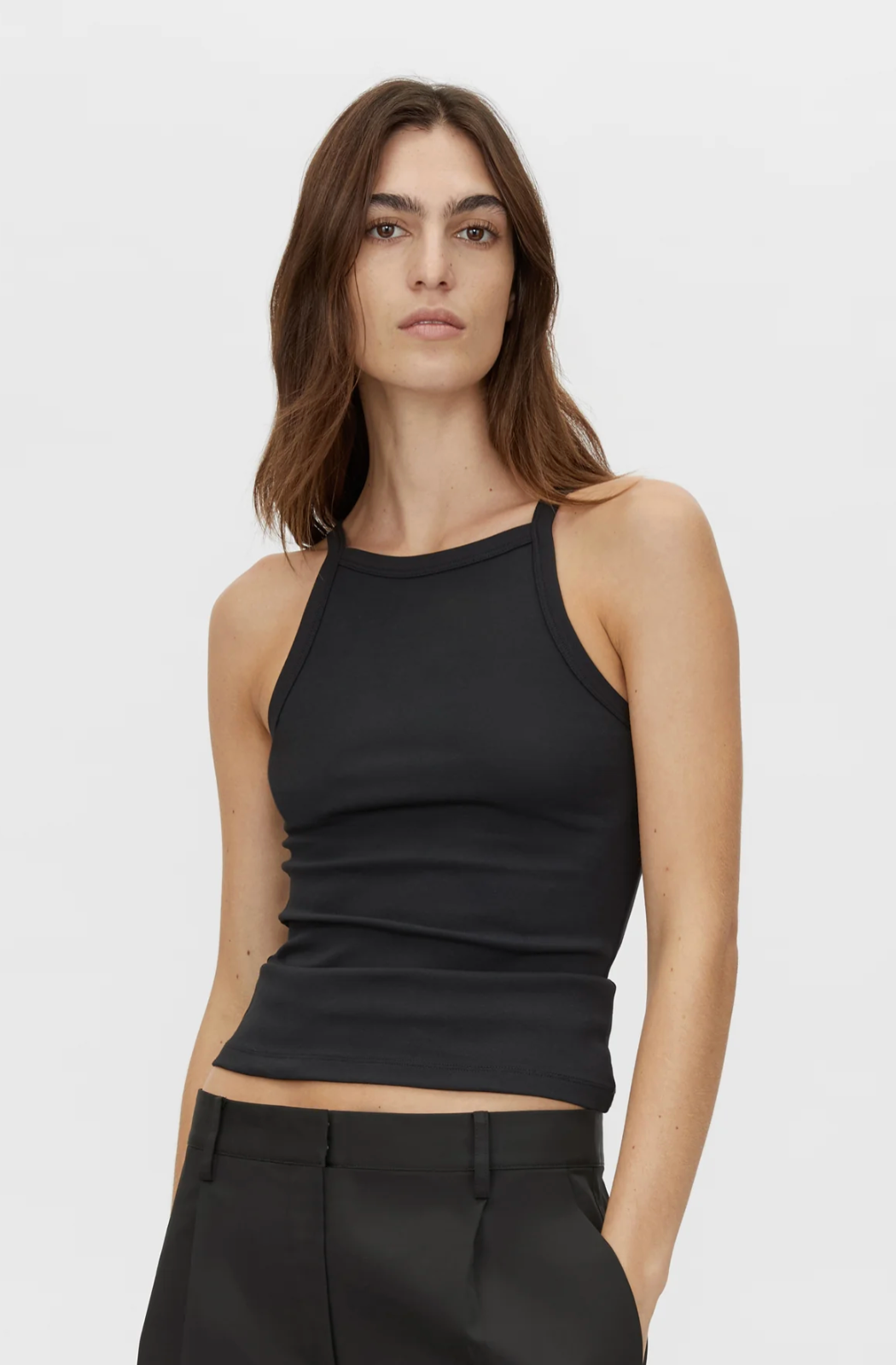 CAMILLA AND MARC Alba high neck, rib cotton blend fitted tank in black with spaghetti straps and rib binding at edges. Twin needle hem.
