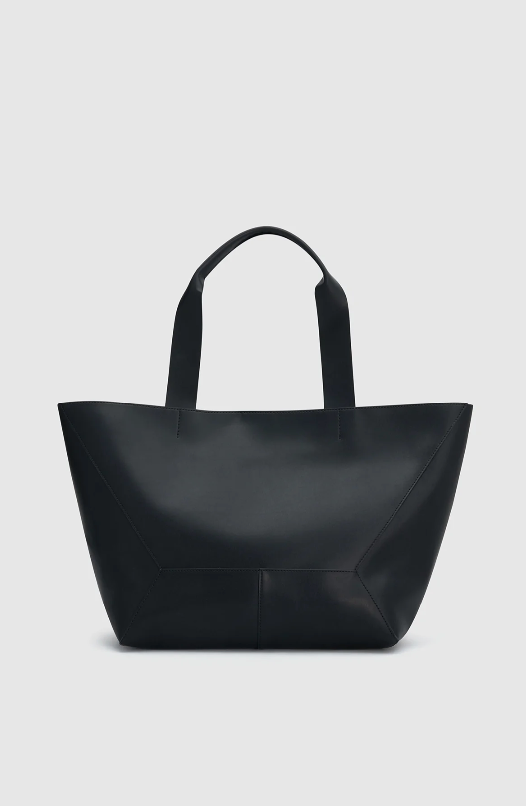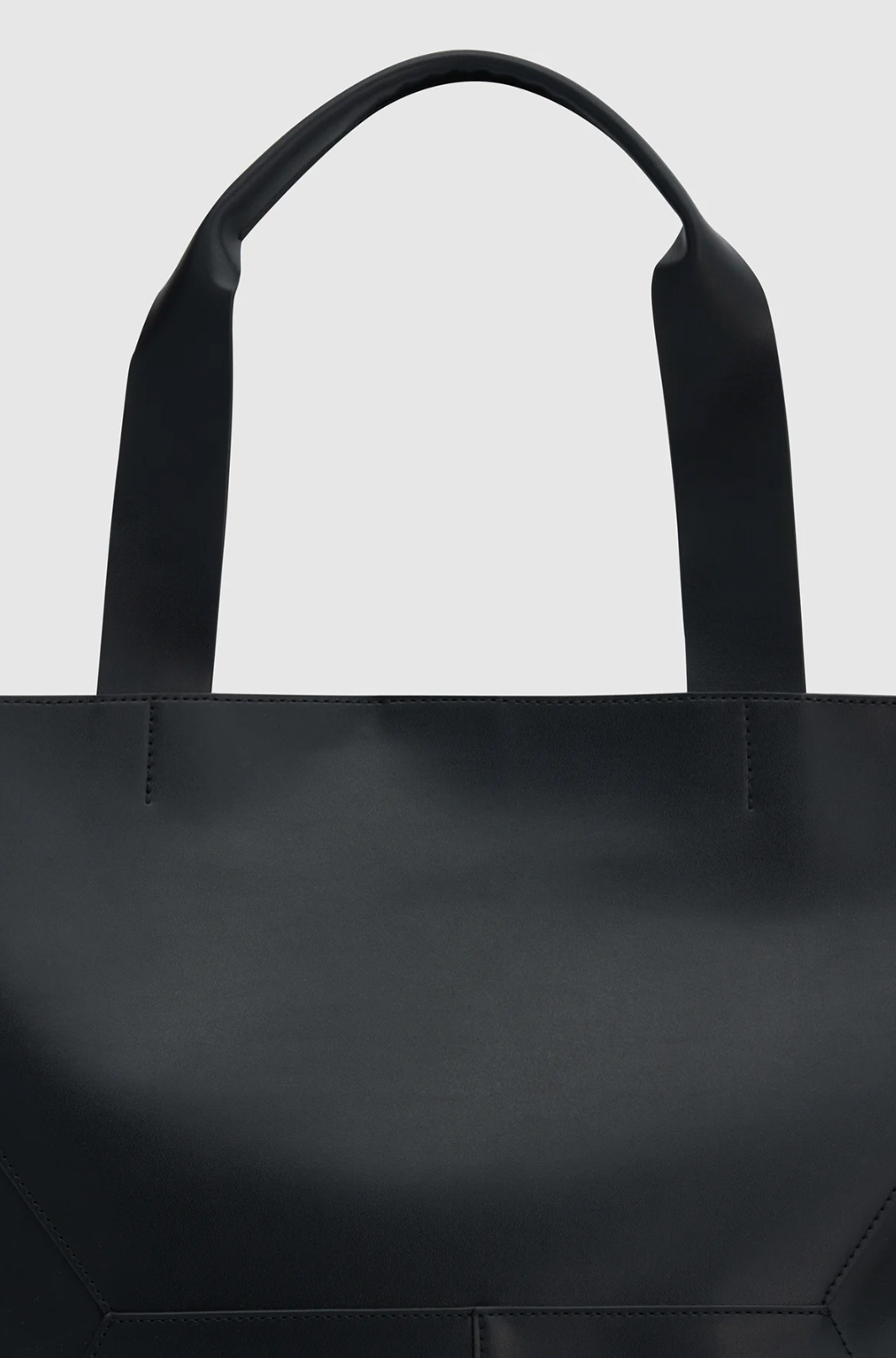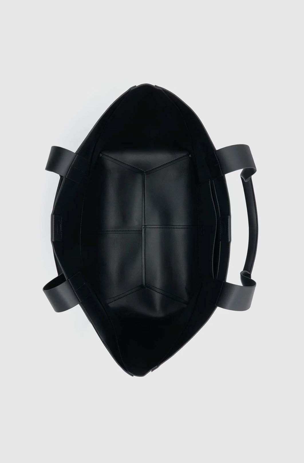CAMILLA AND MARC Ezra geometric panelled tote in black. Embossed monogram logo, hidden magnetic snap closure.