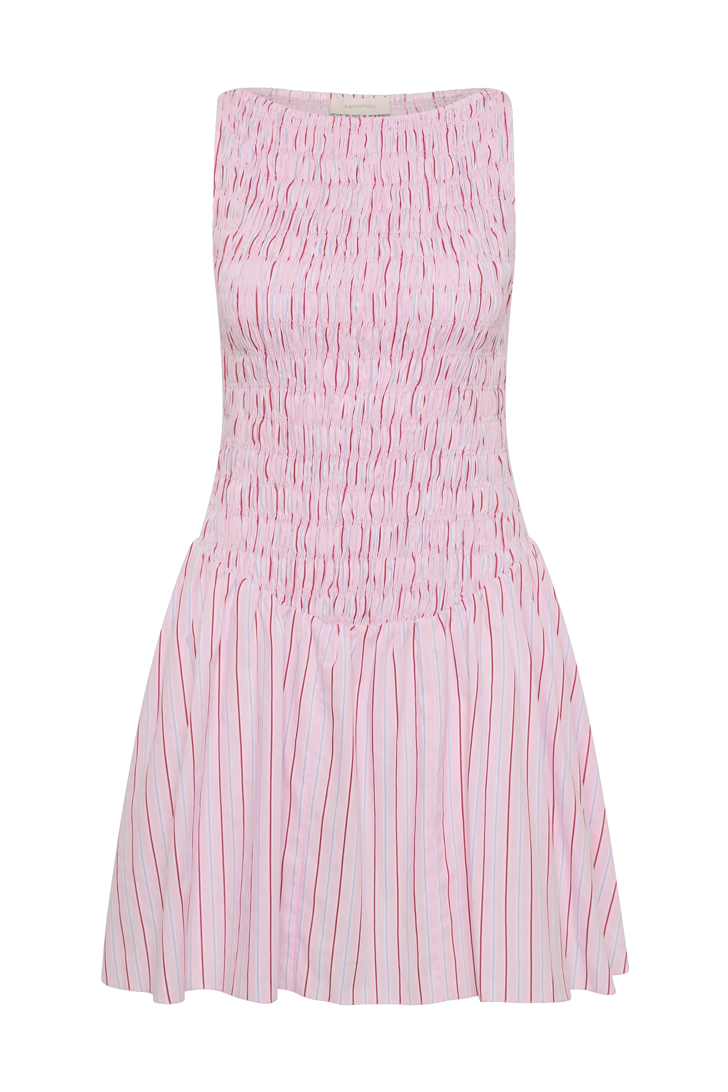 An everyday mini dress, designed from a signature 100% cotton, yarn-dyed in a nostalgic pink and red pinstripe. Sleeveless with a boat-style neckline, the bodice is shirred with a curved, gathered waist. It then falls into a soft A-line skirt that crops short on the body. With lightweight throw-on throw-off appeal, pack for your next summer vacation.