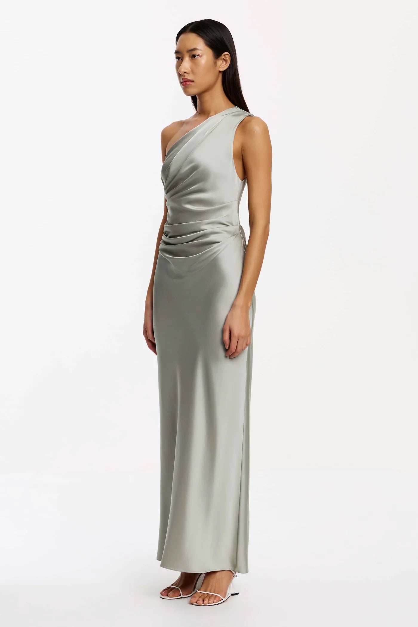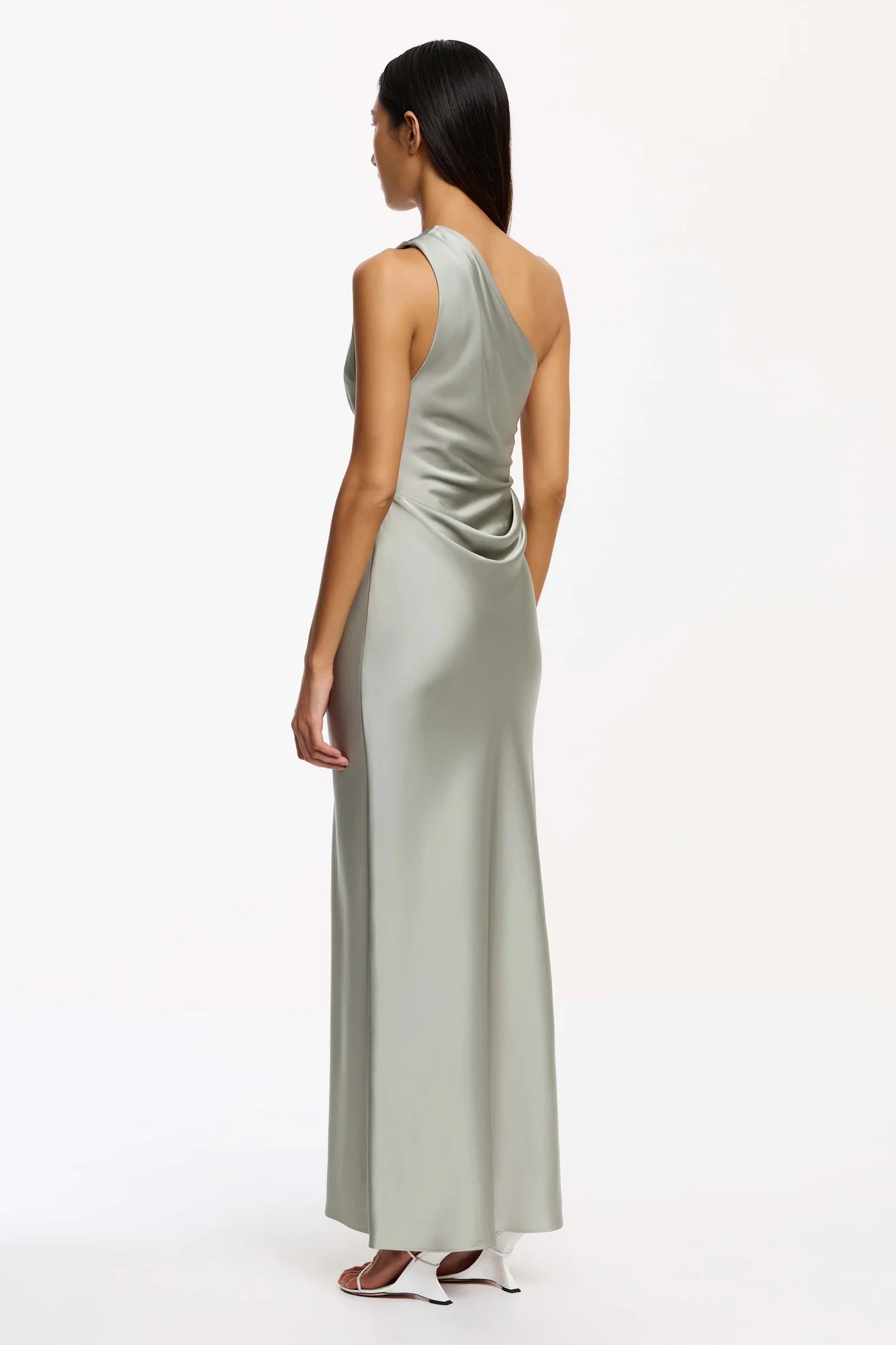 The Angela One Shoulder Maxi Dress in Sage embodies refined minimalism with a sculptural twist. Defined by its bias-cut silhouette and luminous woven satin, this event-ready style showcases an asymmetrical neckline, elegant shoulder tucks, and a dramatic back waist cowl. The lined bodice contrasts a fluid, unlined skirt, perfect for formal occasions requiring subtle statement.
