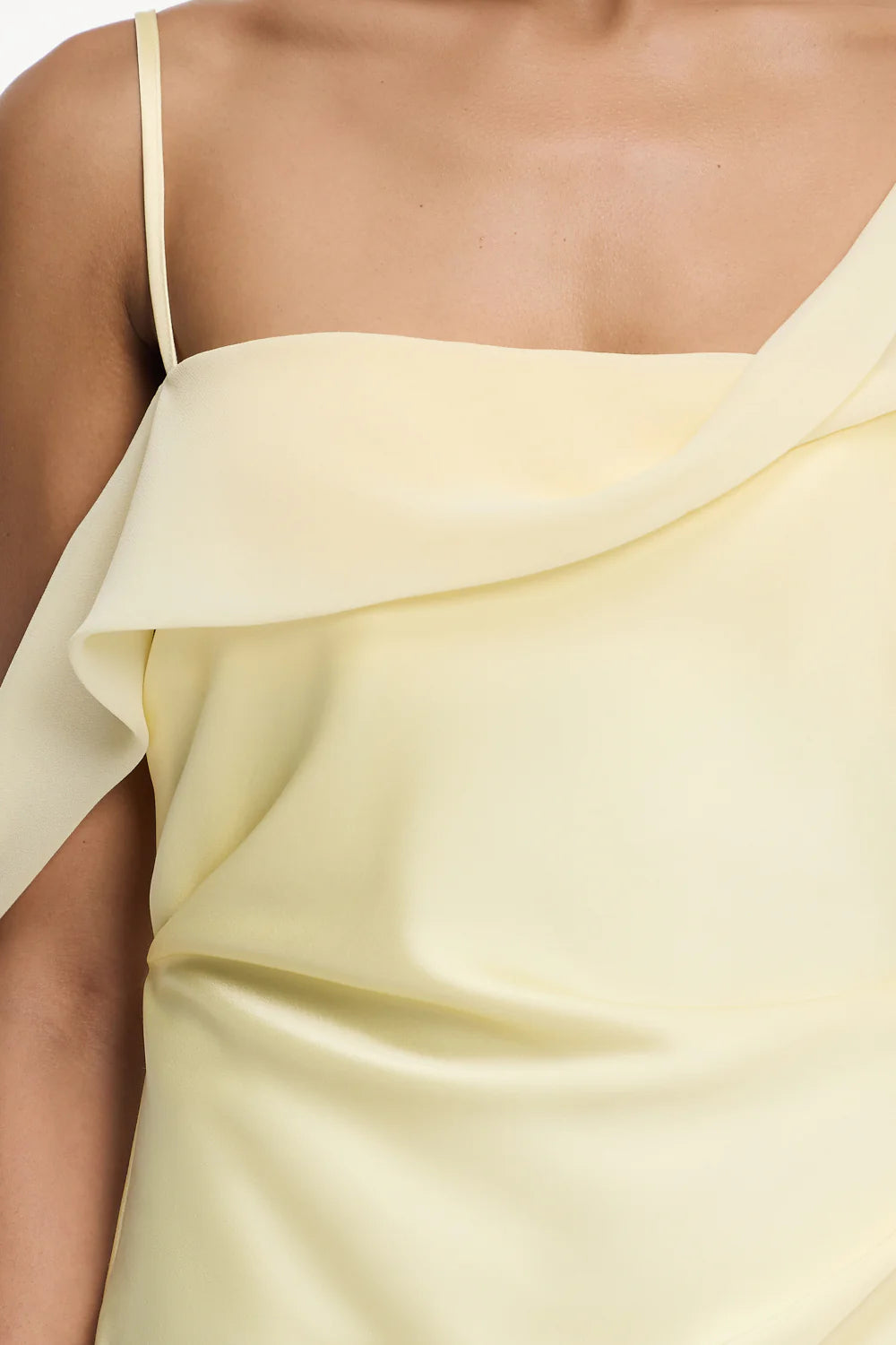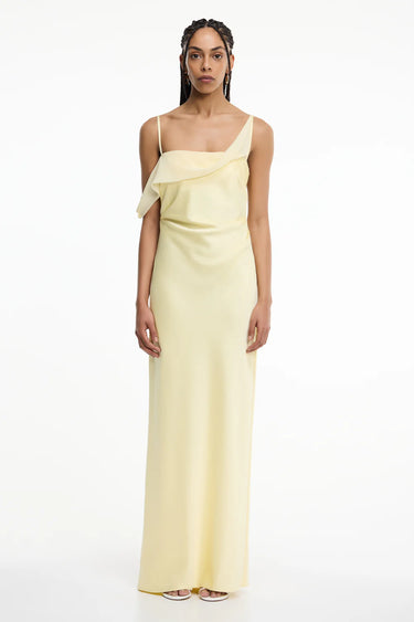 A study in architectural fluidity, The Devlyn Maxi Dress in Butter reveals a striking silhouette with sculptural draping and a unique neckline. A sheer contrast sleeve and neckline detail create movement and intrigue, while the satin fabrication brings a refined finish making it perfect for formal events or elevated evening styling.