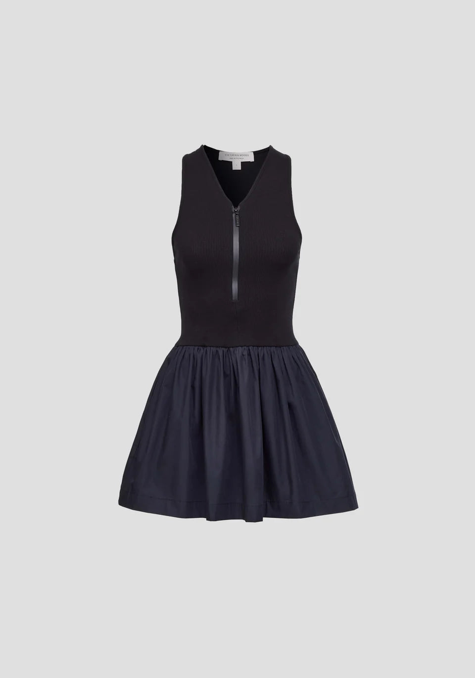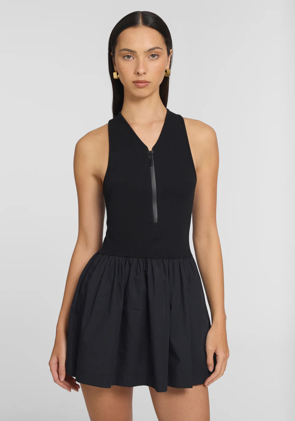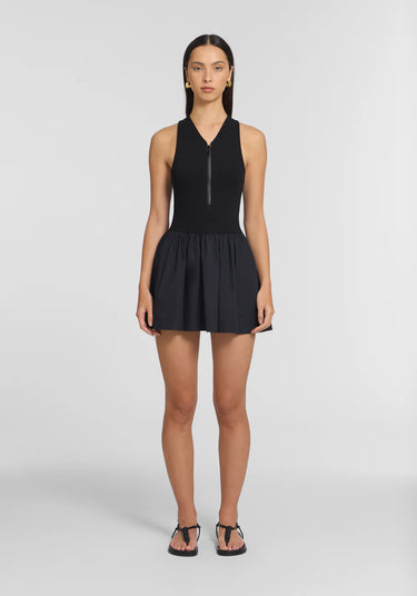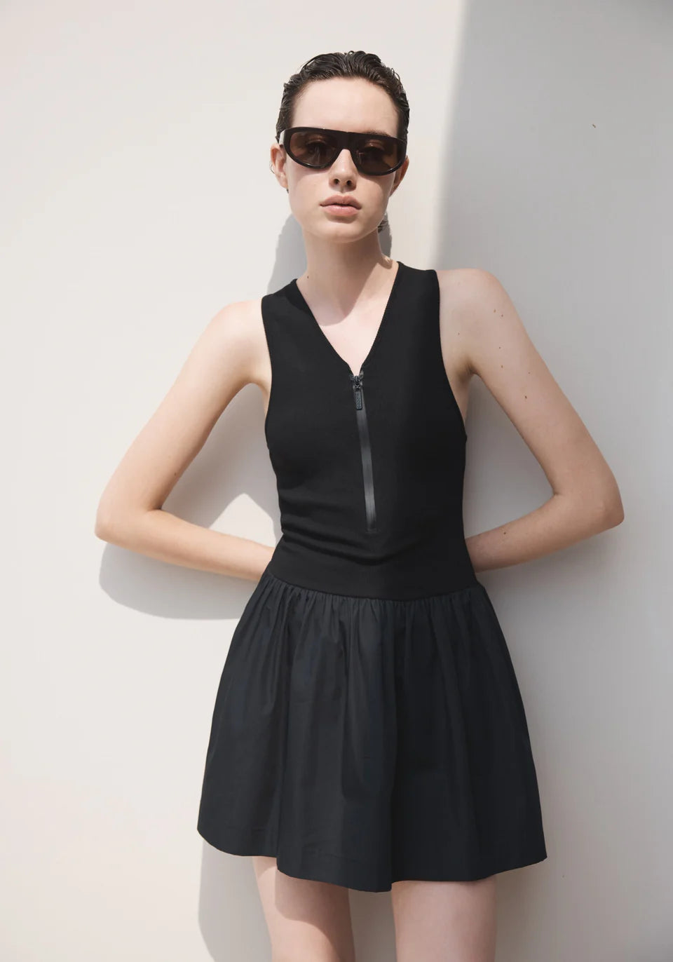 A modern interpretation of the classic tennis dress, the Amusement Dress is crafted from our signature 2x2 organic cotton rib. The ultimate black mini, it features a V-neckline with a zip and soft waist gathering, offering effortless form, designed for a life in motion.
